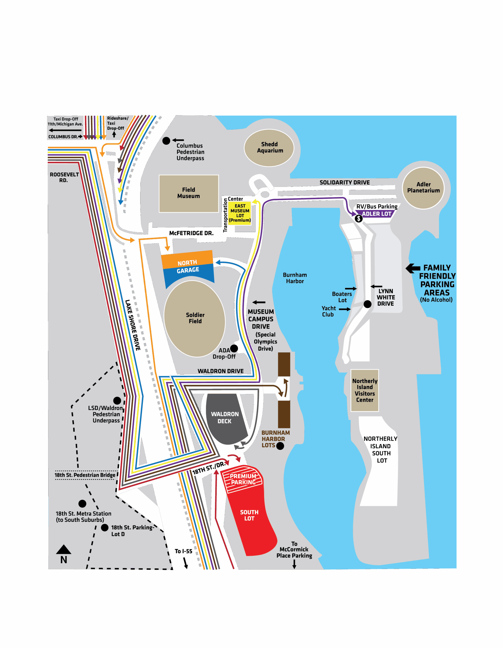 NO SHUTTLES TO OR FROM SOLDIER FIELD: Only lot Lot B, 31st McCormick Place is offering shuttle service from Soldier Field. All other locations no longer provide shuttle service to or from Soldier Field.